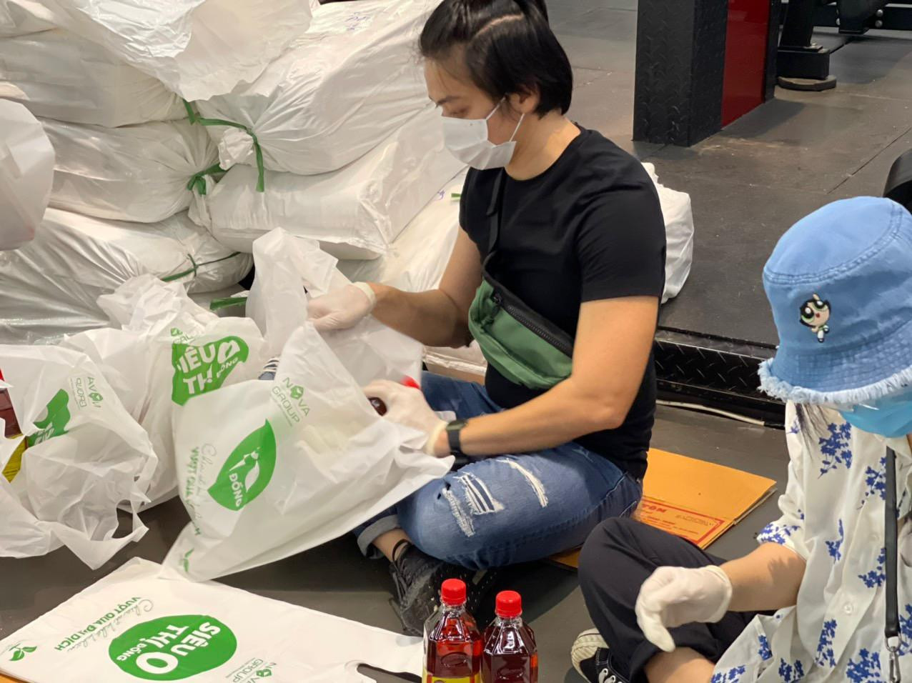 | Nữ ca sỹ Uyên Linh có mặt từ sáng sớm, nhanh tay đóng gói nhu yếu phẩm cho bà con. |