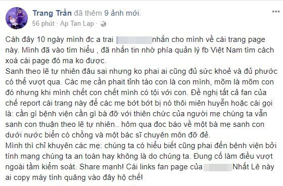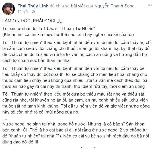 Ngày 14/3, một phụ nữ có tài khoản Facebook là M.P sống tại TP.HCM cho biết bạn của chị sinh con đầu lòng, đã bỏ ra 15 triệu để học một khóa thai sản thuận tự nhiên như mạng xã hội chia sẻ và thực hiện sinh con tại nhà một mình. Vì ở nhà sinh con mà không có bác sĩ hỗ trợ nên người mẹ kiệt sức, con chết ngạt nên cùng tử vong. Khi chồng về thì cả hai mẹ con đã không cứu được nữa. Câu chuyện khiến nhiều người xót xa, đau lòng.