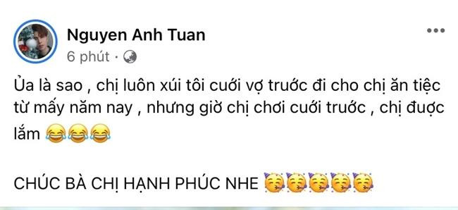 Trong khi đó, Will có bài viết khá "hoảng hốt": "Ủa là sao, chị luôn xúi tôi cuới vợ truớc đi cho chị ăn tiệc từ mấy năm nay, nhưng giờ chị chơi cuới truớc, chị được lắm. Chúc bà chị hạnh phúc nhé."