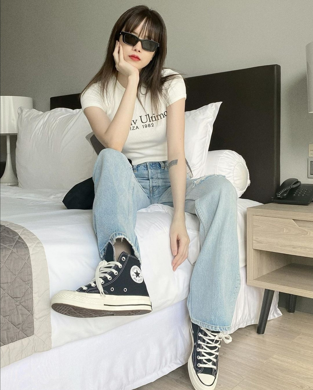 Thiều Bảo Trâm năng động và thời trang với áo phông trắng in chữ mix cùng quần jeans ống rộng, mắt kính đen và giày sneaker tone-sur-tone.