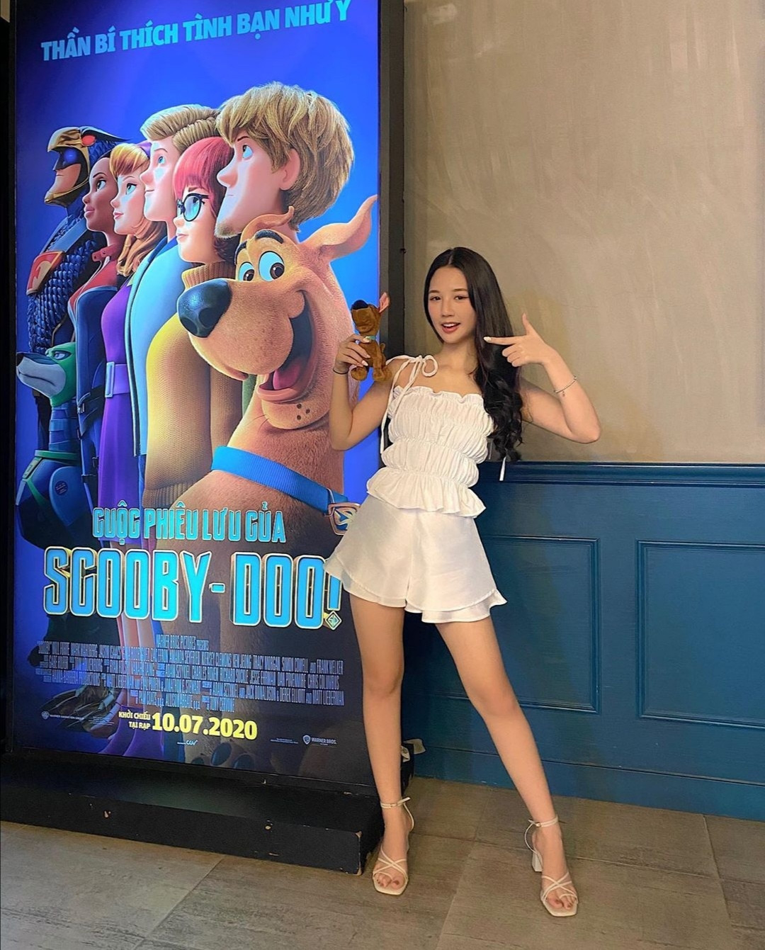 Amee đi xem phim với set đồ khá đơn giản và đáng yêu, áo hai dây nhún bèo mix với quần soóc chất liệu satin và giày thắt dây toàn màu trắng.