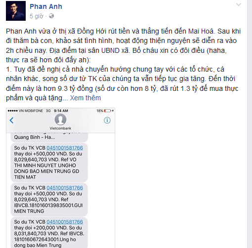 Đêm 16/10, MC Phan Anh bắt đầu kêu gọi quyên góp cho người dân miền Trung hai tỉnh Hà Tĩnh- Quảng Bình trên trang cá nhân của mình. Để đi đầu cho hành động thiện nguyện này, Phan Anh chủ động nộp 500 triệu đồng vào số tài khoản chung dành cho công tác cứu trợ vùng lũ.