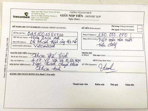 Ngày 17/10, Ngọc Trinh chia sẻ hình ảnh biên lai gửi tiền 150 triệu đồng ủng hộ đồng bào miền Trung trên trang cá nhân của mình. “Nữ hoàng nội y” đã gửi số tiền này tới tài khoản của MC Phan Anh khi anh kêu gọi quyên góp đêm 16/10.