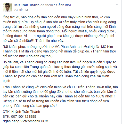 Hôm qua (18/10), danh hài Trấn Thành chia sẻ đoạn trạng thái trên trang cá nhân của mình. Theo đó, Trấn Thành viết: “Ông trời ơi, sao đoạ đầy dân con đến như vậy? Nhìn hình thôi, ko còn muốn nói gì nữa. Họ đã quá khổ rồi! Ai cảm thấy mình còn chút rung động trong trái tim của những con người cùng đón nắng mai trên cùng một lãnh thổ thì hãy cùng nhau hành động thôi. Mỗi người một tí, nhiều cũng được, ít cũng được. Vì 1 người góp ít, mà kêu gọi được nhiều người góp thì nó vẫn sẽ là nhiều! Thành tin như vậy.
