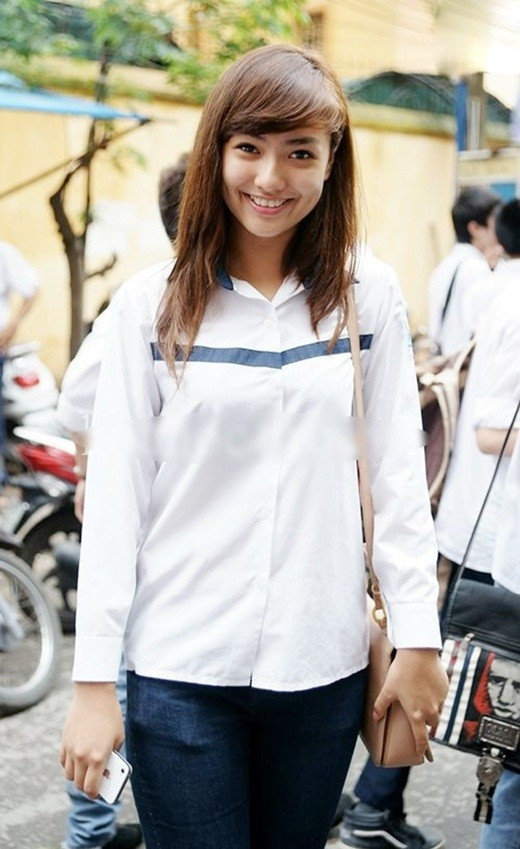 Khác với những hình ảnh lộng lẫy trên sàn cat walk, Hồng Quế khi đến trường là cô gái trong sáng, ăn vận đơn giản với áo trắng và quần jeans. Ảnh: VTC