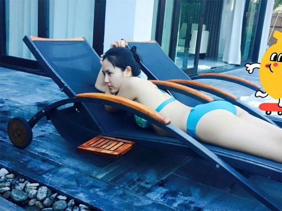 Nữ ca sĩ Phương Linh mặc bikini màu xanh mát mắt nằm trên ghế khoe thân hình cuốn hút.