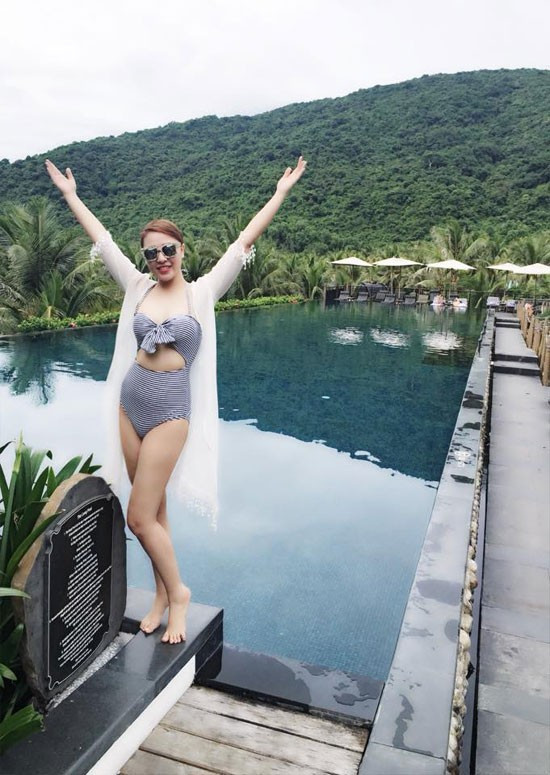 Quỳnh Thư điệu đà và nữ tính trong bộ áo tắm kẻ sọc ngang. Gương mặt cô tràn đầy hạnh phúc trong chuyến đi chơi với bạn trai gần đây.