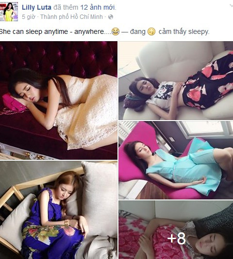 Khi Kỳ Duyên xảy ra sự cố, Lilly Luta khá nhiệt tình ủng hộ Hoa hậu Việt Nam 2014. Mới đây, người đẹp 9X đã chia sẻ loạt ảnh cô say ngủ với nhiều thế nằm. Người đẹp cho rằng, bản thân có thể ngủ ở mọi nơi, mọi lúc.