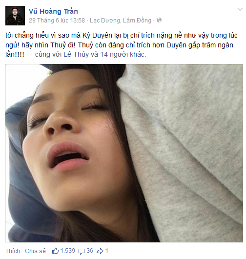 Riêng hot girl Thủy Top, cô bị bạn bè "bóc mẽ" khoảnh khắc xấu khi đang ngủ để bênh vực Hoa hậu Kỳ Duyên. Bức ảnh "ngủ xấu" của thí sinh Tuyệt đỉnh tranh tài thu hút hơn 1.500 lượt bấm yêu thích.