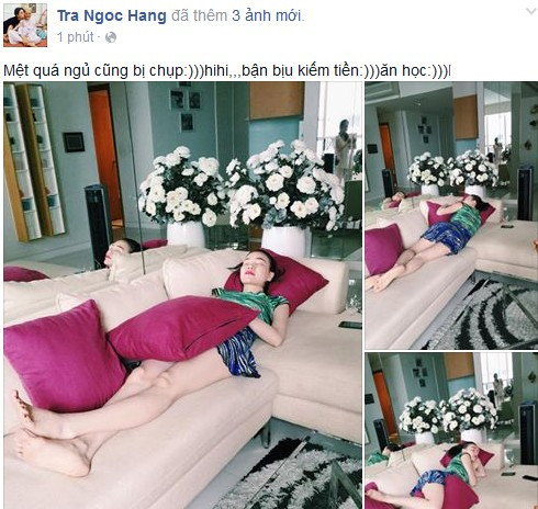 Trên trang cá nhân, Trà Ngọc Hằng tâm sự, công việc bận rộn khiến cô ngủ gục lúc nào không hay mỗi khi trở về nhà. Người đẹp còn hài hước trách người chụp ảnh: "Bận bịu kiếm tiền ăn học. Mệt quá ngủ cũng bị chụp hình".