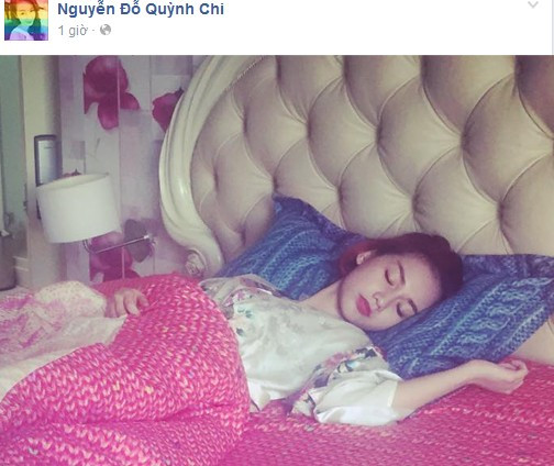 Quỳnh Chi đăng tấm ảnh cô "say giấc" trong trạng thái không tẩy trang. MC - ca sĩ cho biết, do chạy show đến tối khuya nên cô sẽ ngủ ngay khi vừa về đến nhà. Việc quên tẩy trang diễn ra thường xuyên. Thậm chí, có khi cô còn thức dậy lúc nửa đêm để rửa mặt và ăn bữa nhẹ lót dạ.
