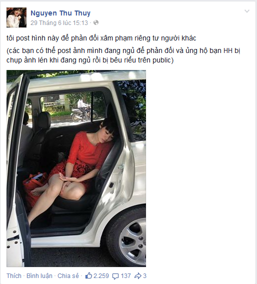 Trên trang cá nhân, Hoa hậu Thu Thủy chia sẻ ảnh để phản đối việc xâm phạm sự riêng tư của người khác và ủng hộ đàn em Kỳ Duyên khi cô bị chụp lén lúc đang ngủ với dáng khó đỡ.