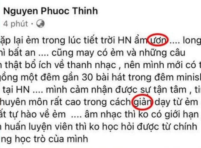 Trước đó, nam ca sĩ cũng từng bị netizen phát hiện lỗi chính tả khi đăng bài trên trang cá nhân kể về một lần luyện thanh nhạc của mình. Anh đã viết "ẩm ươn" thay vì "ẩm ương", "giản dạy" thay vì "giảng dạy".