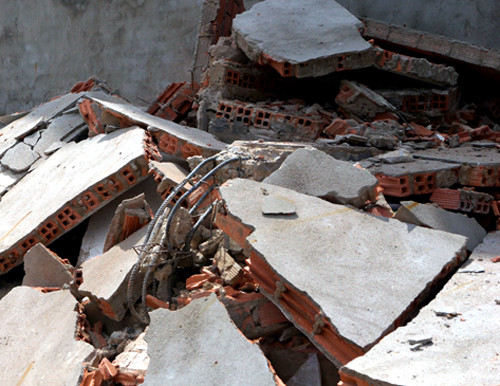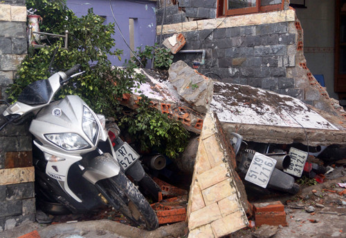 Căn nhà bị sập nhìn từ phía sau. Tại hiện trường, toàn bộ hàng cột ở tầng một căn nhà này bị gãy. Cả khối nhà còn lại hiện nằm cách xa hàng cột của móng nhà hơn 2 mét và đè lên căn của anh Bửu khiến nhà anh hư hỏng nặng, có nguy cơ đổ sập bất cứ lúc nào.