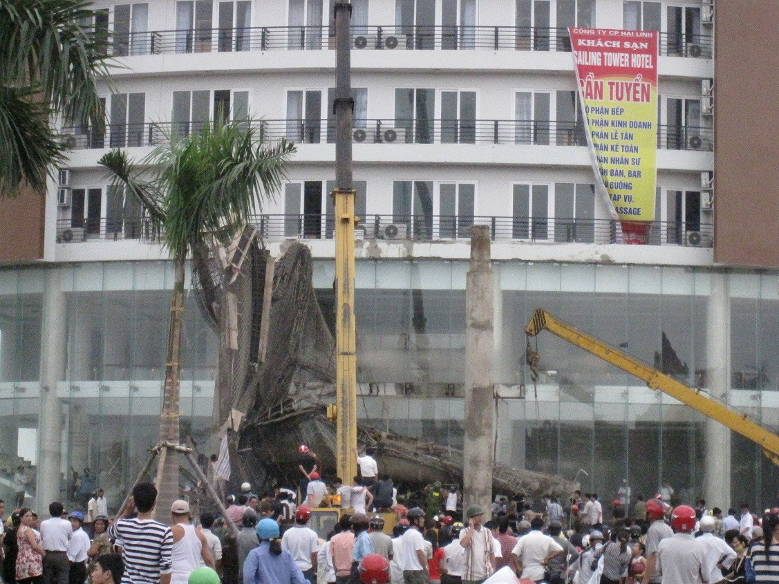 Được biết, trước khi sảnh khách sạn này bị sập, hơn 10 công nhân đang thi công. Nhiều người dân sống gần khách nạn này cho biết, họ nghe một tiếng động rất lớn, khi chạy đến thấy một đống đổ nát, một công nhân đu người trên cột dầm kêu cứu.