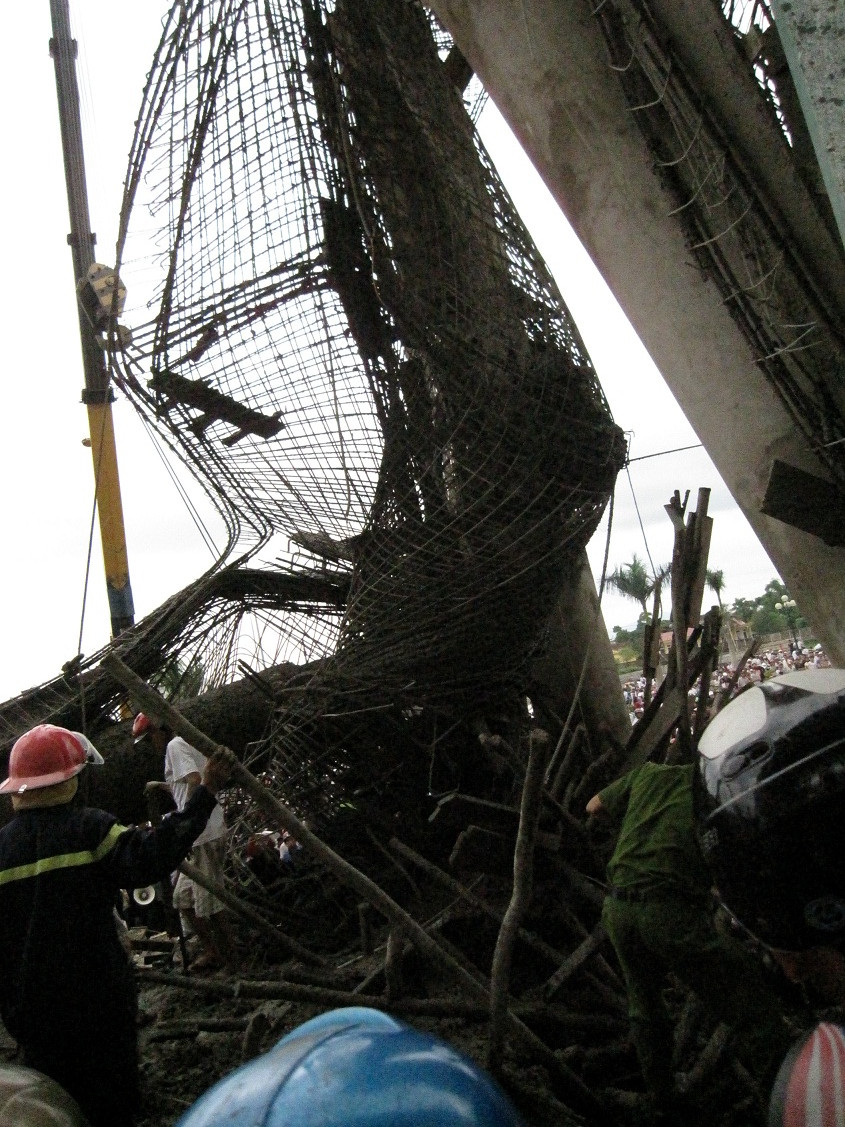 Tại hiện trường, hai cột trụ bị đổ, hàng chục tấn xi măng, sắt thép, cột pha ngổn ngang. Bốn xe cẩu cùng hàng trăm chiến sỹ công an, người dân đang tích cực dọn dẹp đống đổ nát tìm nạn nhân.