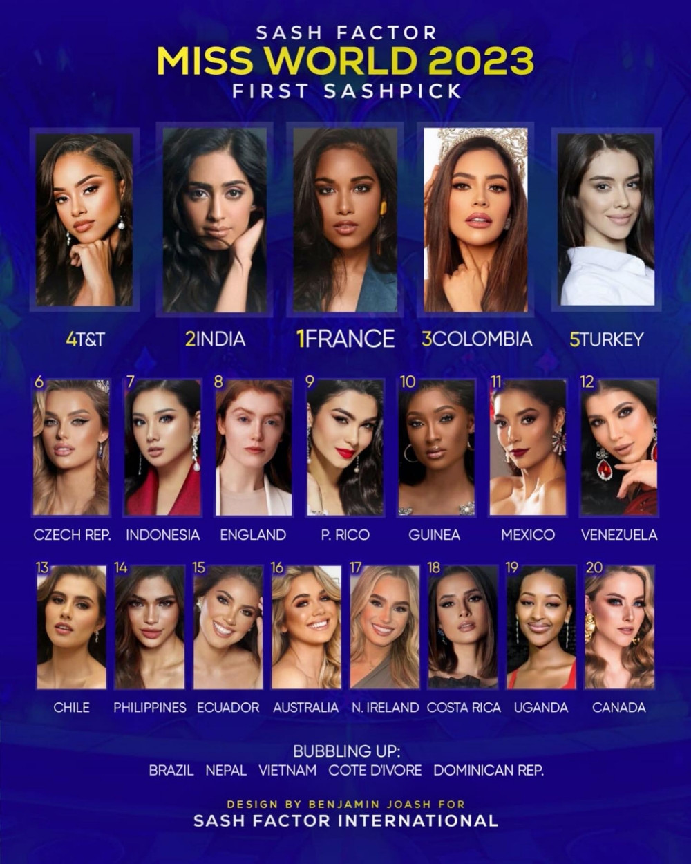 Chính vì số lượng thí sinh đông đảo, nên tỉ lệ cạnh tranh cũng vô cùng khốc liệt. Các nước đều sẽ cử đại diện xuất sắc nhất cả về tài về sắc đến với Miss World. Mới đây, chuyên trang Sash Factor đã tung BXH dự đoán đầu tiên của cuộc thi.