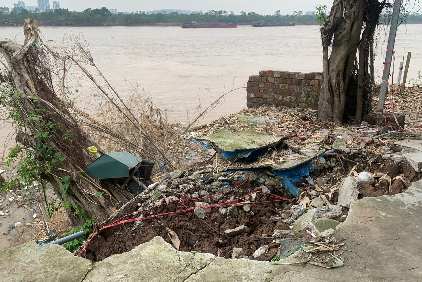 Người dân làng gốm cổ Kim Lan (xã Kim Lan, huyện Gia Lâm, Hà Nội) cho biết, ngày 22/9, tình trạng sạt lở đất ven sông tiếp tục diễn ra tại đê tả sông Hồng. Khu vực sạt lở ăn sâu vào khoảng 5m tại thôn 4, vào sát mép 3 hộ dân đang sinh sống, cách mặt nước khoảng 8m.