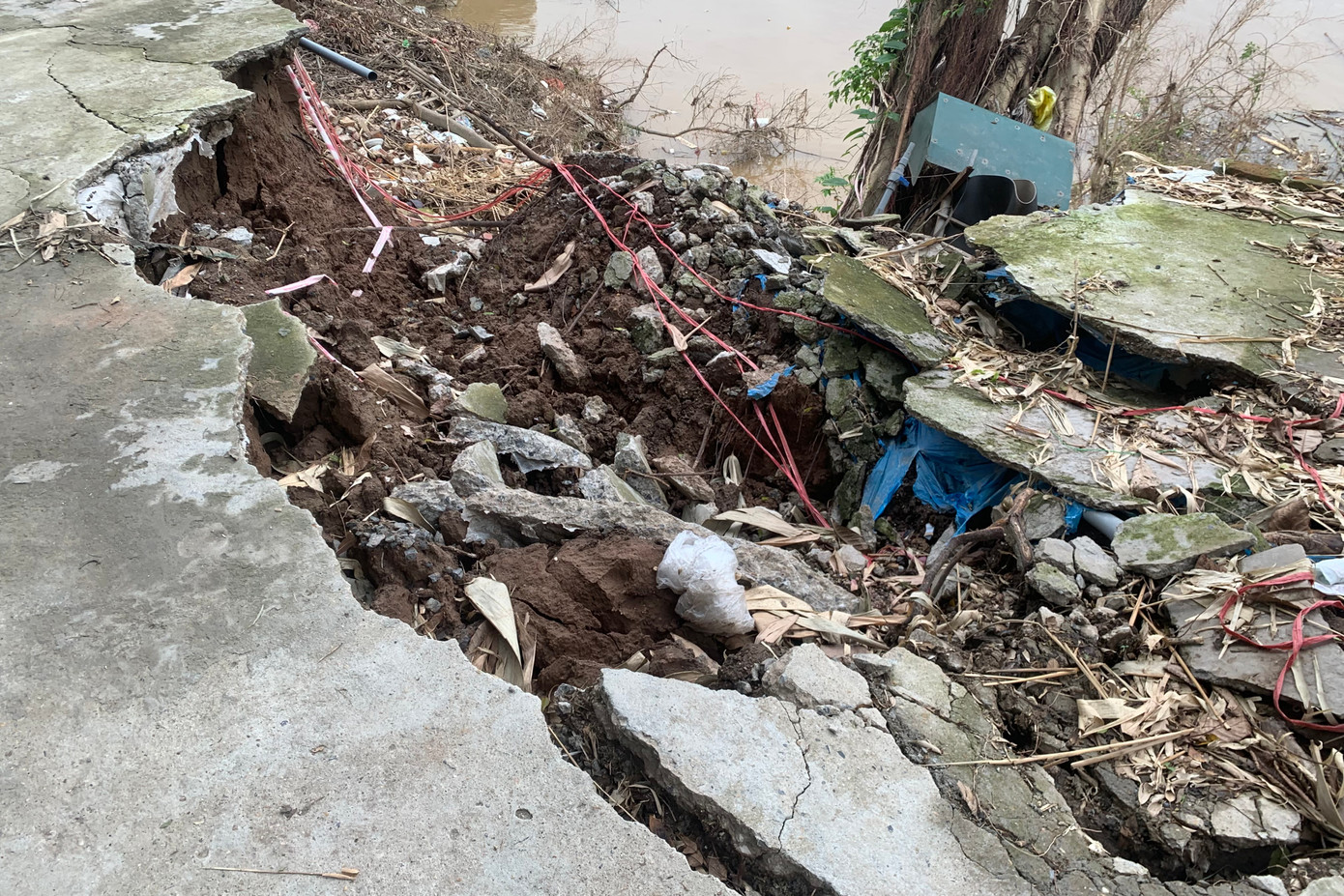 | Ống nước ngầm lộ ra sau vụ sạt lở. |