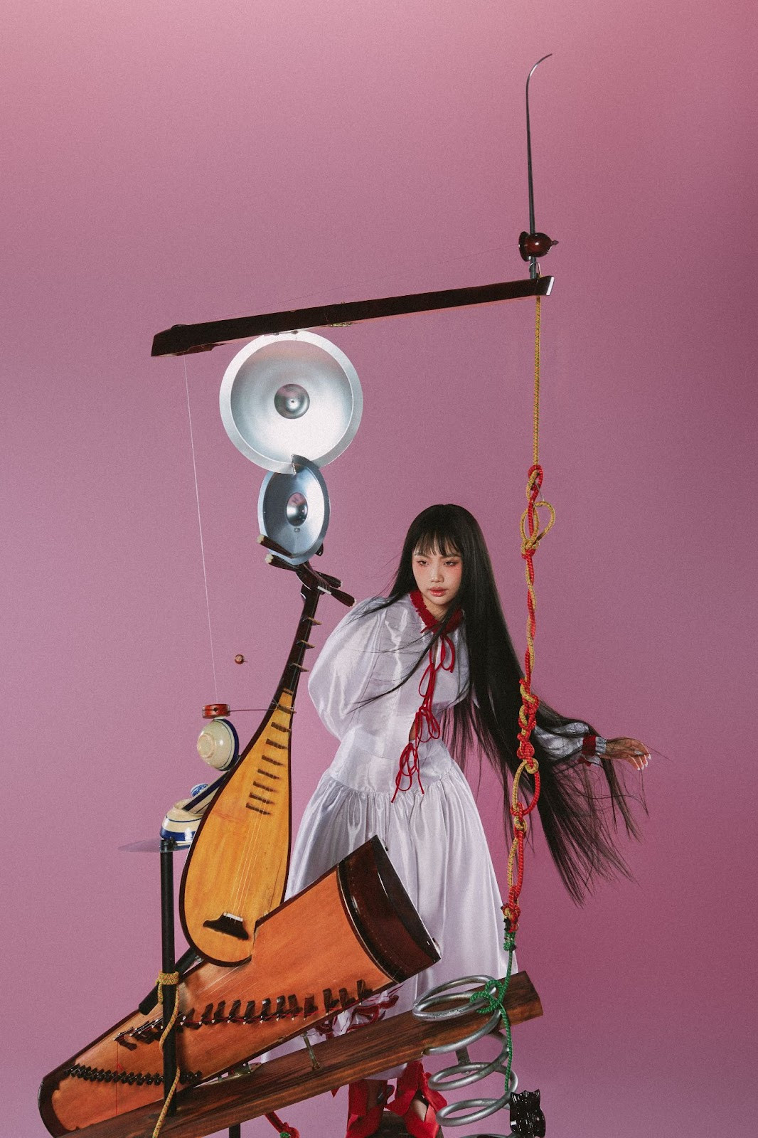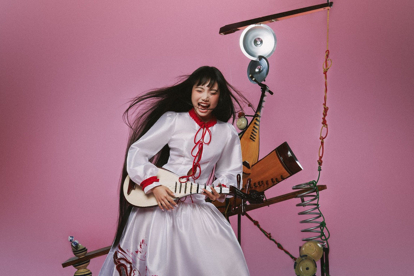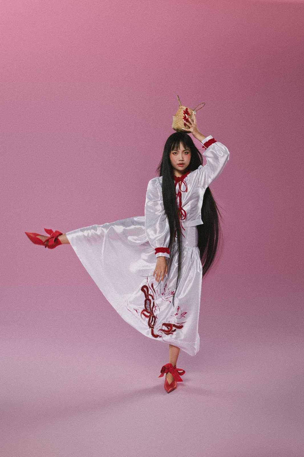 Bộ ảnh với gam màu đỏ - trắng mang đặc trưng phong cách Á Đông. Giọng ca vàng trong làng dân ca diện trang phục độc nhất màu trắng. Váy và áo cách được thiết kế cách điệu, phần cạp cao ở váy tạo sự thon gọn cho vòng eo, điểm xuyết bằng các chi tiết màu đỏ nổi bật và họa tiết con cò.