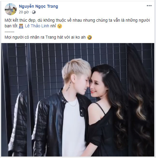 Theo đó, Ngọc Trang đã chính thức thông báo về việc chia tay người yêu Lin Jay (tên thật là Lê Thảo Linh) sau 2 năm sống thử. Đồng thời dưới phần bình luận, nữ MC sinh năm 1986 cho biết dù chia tay nhưng cả hai vẫn giữ mối quan hệ bạn bè. Cô chia sẻ: “Cảm ơn mọi người đã quan tâm, Trang và Lin Jay cảm thấy là bạn của nhau thì tốt hơn là làm người yêu nên cả 2 đều hài lòng với quyết định này! Cảm ơn rất nhiều”.