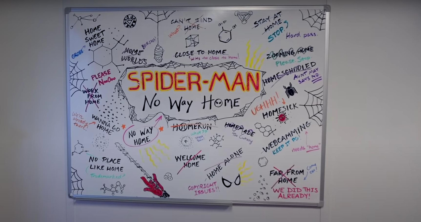 Tuy nhiên, trong lúc đi ra ngoài, họ tình cờ bước ngang một tấm bảng cho thấy tựa phim sắp tới chính là Spider-Man: No way home. Ngoài tên phim chính thức, người hâm mộ cũng dễ dàng nhận ra những sự lựa chọn khác bị loại đi một cách hài hước, như Home Alone thuộc một thương hiệu phim ăn khách khác, Work From Home, Zooming Home và Stay At Home làm liên tưởng tới đại dịch COVID-19, Home-Schooled (học tại nhà) thì bị dì May phản đối hay Webcamming lại thiếu mất chữ "Home"...