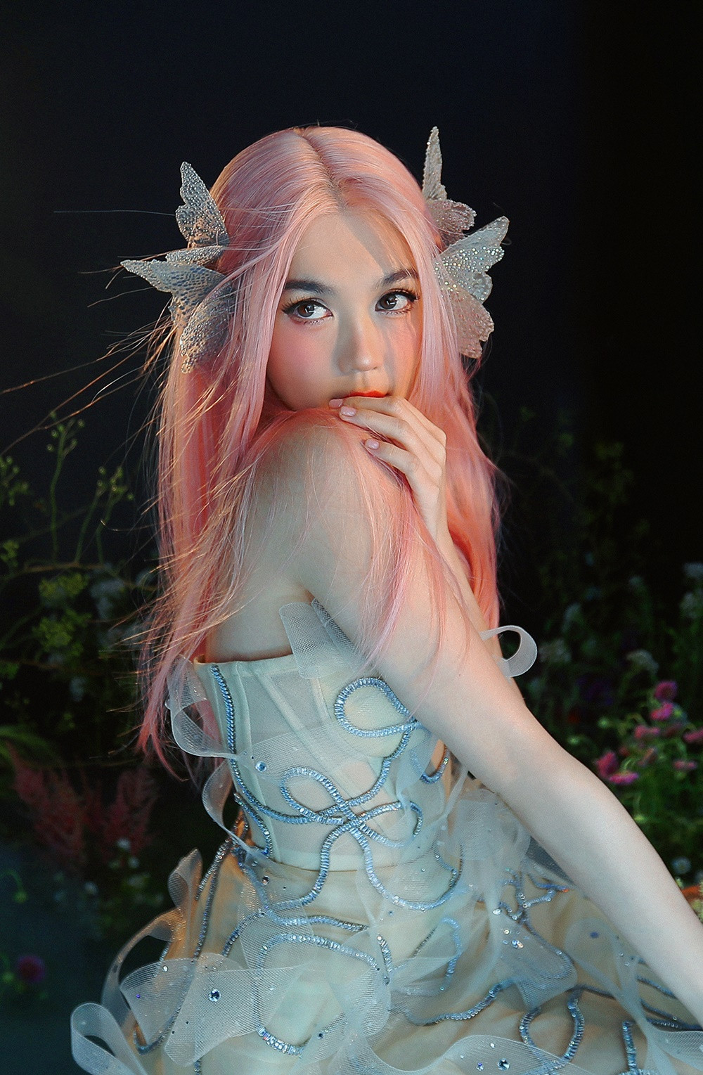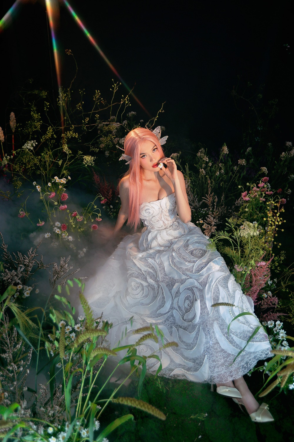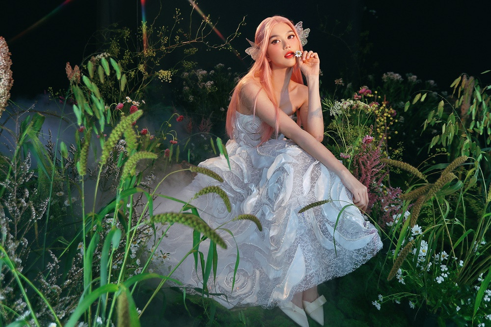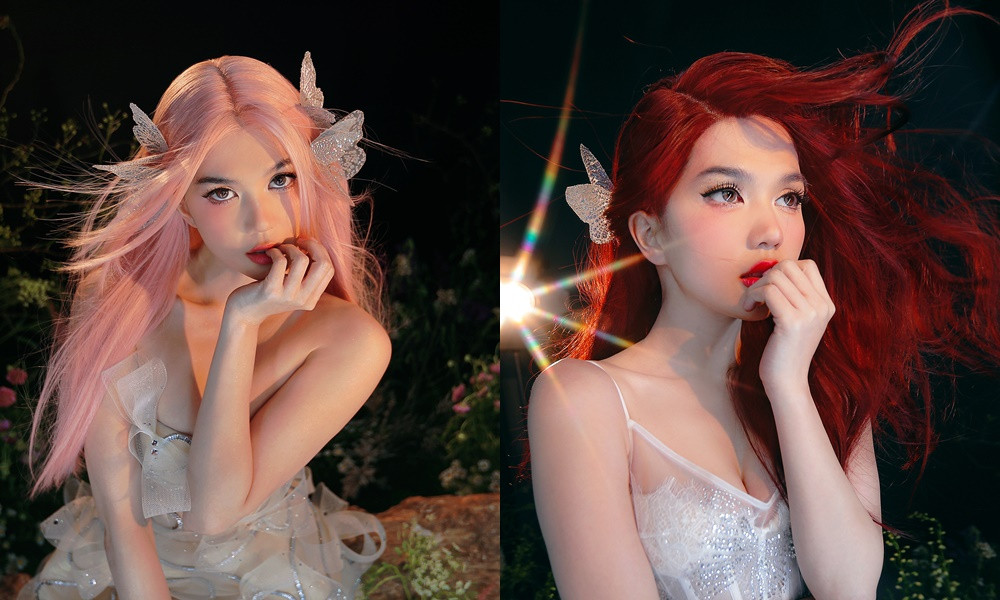 Lần lượt khoe dáng trong 6 bộ váy tông màu bạc và vàng ánh kim, Ngọc Trinh biến hóa cảm xúc tài tình, lúc e ấp ngại ngùng, khi lại kiêu sa. Người đẹp còn thay đổi hai bộ tóc giả màu hồng và đỏ rượu, làm tăng hiệu ứng AI kỳ ảo đậm chất cổ tích của bộ ảnh.