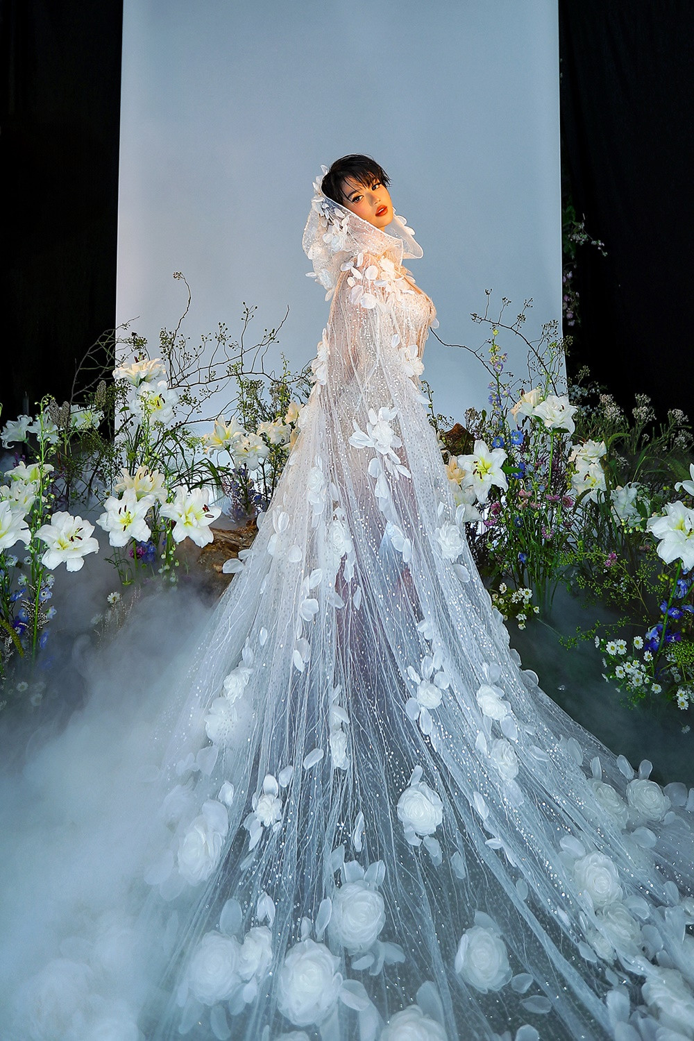 Cũng với chiếc bodysuit này, Ngọc Trinh choàng thêm chiếc áo xuyên thấu đính hoa hồng 3D là đã có ngay vẻ khác lạ. Tấm áo dài 5 m kèm mũ trùm đầu khiến cô đẹp tựa nữ thần trong khu rừng đầy hoa trái.