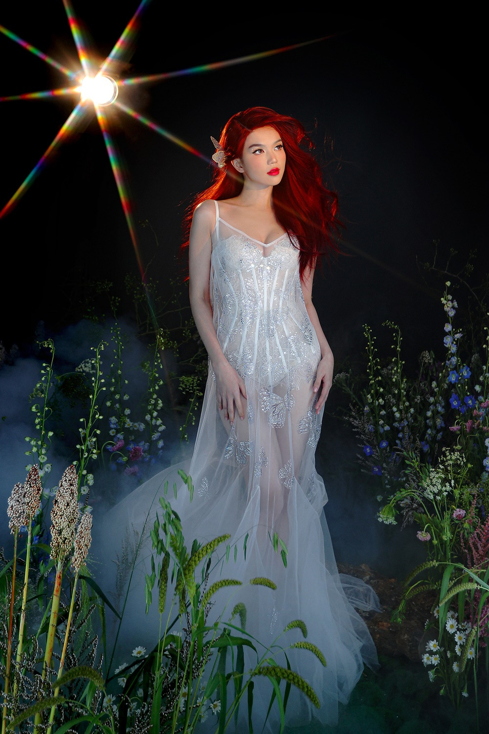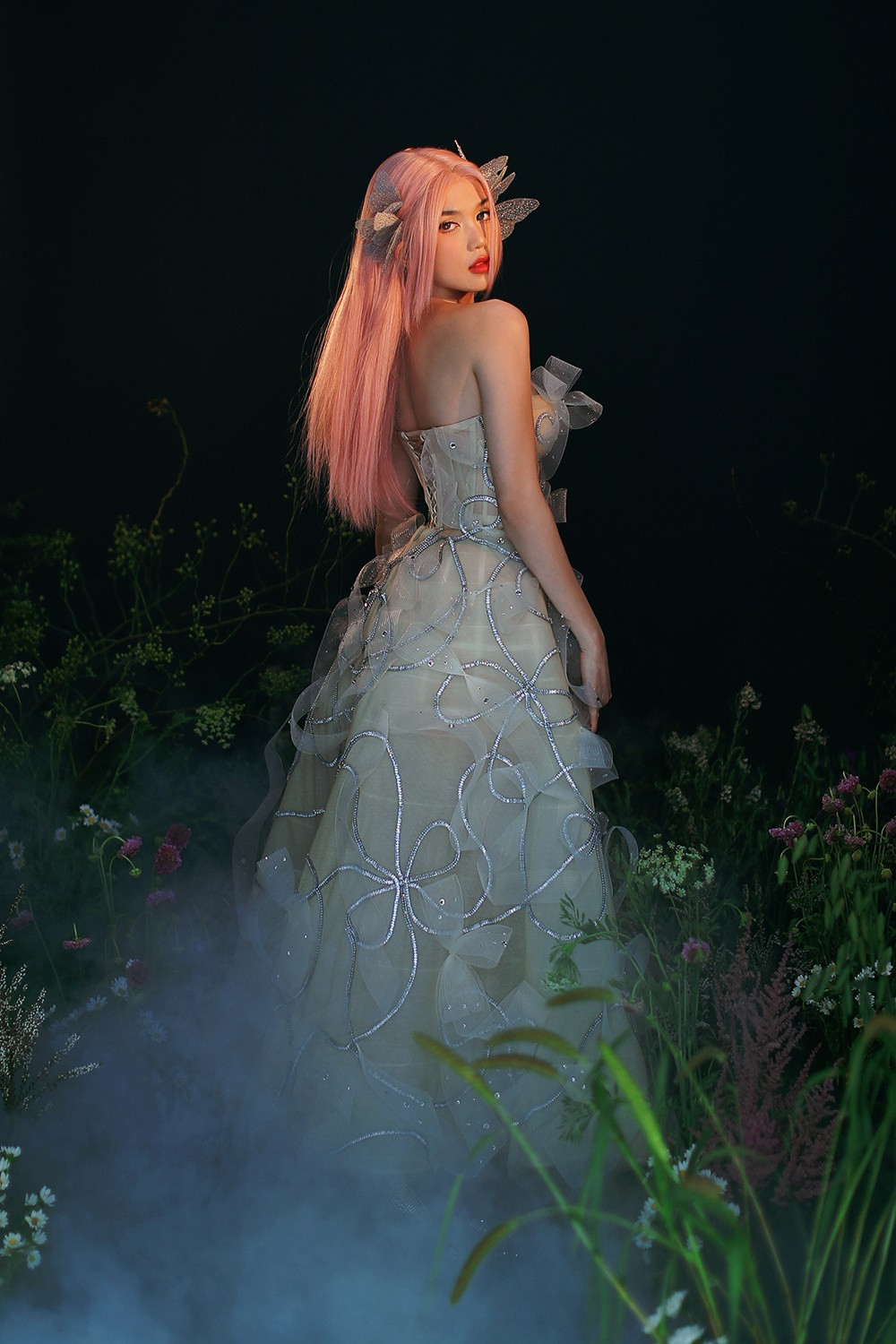 Đầm xuyên thấu kết hợp bodysuit dựng phom corset luôn được nhiều mỹ nhân yêu thích vì khoe trọn thân hình thắt đáy lưng ong. Đặc biệt nhất là trang phục đính đá tạo nên các họa tiết cánh bướm - xu hướng đang thịnh hành trên thế giới.