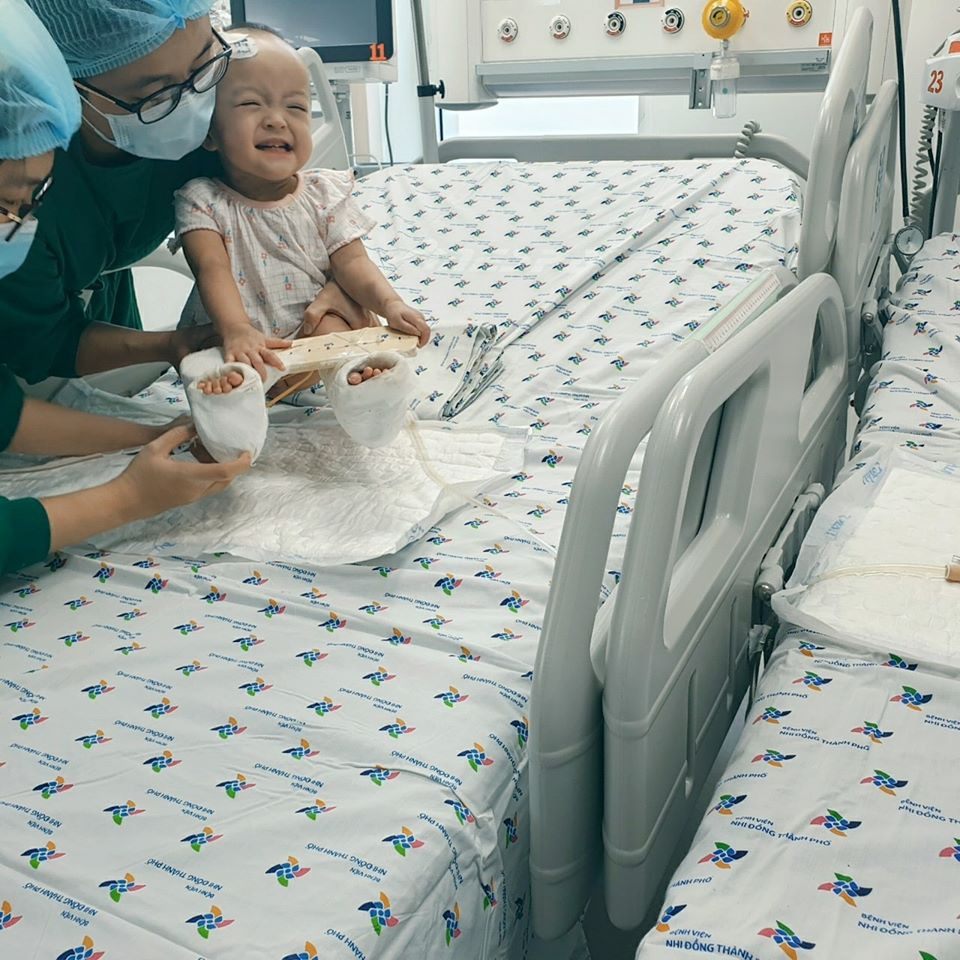 Trúc Nhi đã được tháo bột nẹp chân hoàn toàn (ảnh: BVCC) Theo Bệnh viện Nhi đồng Thành phố, các vết thương vùng tiết niệu, sinh dục và hậu môn tạm của Trúc Nhi và Diệu Nhi cũng khô thoáng. Trúc Nhi đã tháo nẹp bột, hai chân tự do di chuyển.