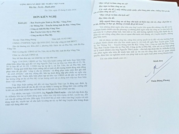 Trước đó, ngày 4/7, Phòng Bảo vệ an ninh chính trị nội bộ (PA03), Công an tỉnh Bà Rịa-Vũng Tàu đã làm việc với ông Luyện để xác minh, làm rõ những phát ngôn của ông này trên mạng xã hội bị ông Thân Đăng Phong - chủ tịch UBND xã Tóc Tiên, kiến nghị ngành chức năng xử lý.