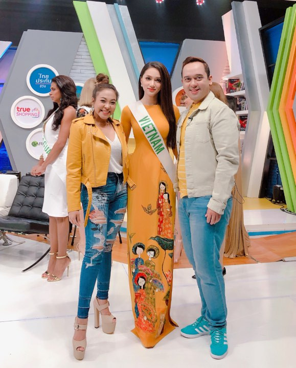 Hương Giang cùng 28 thí sinh có buổi ghi hình phỏng vấn cho một trong những kênh truyền hình nổi tiếng nhất Thái Lan - GMM và sẽ được phát sóng vào ngày 6/8 tới. Hương Giang xuất hiện nổi bật với trang phục áo dài màu vàng rực rỡ.