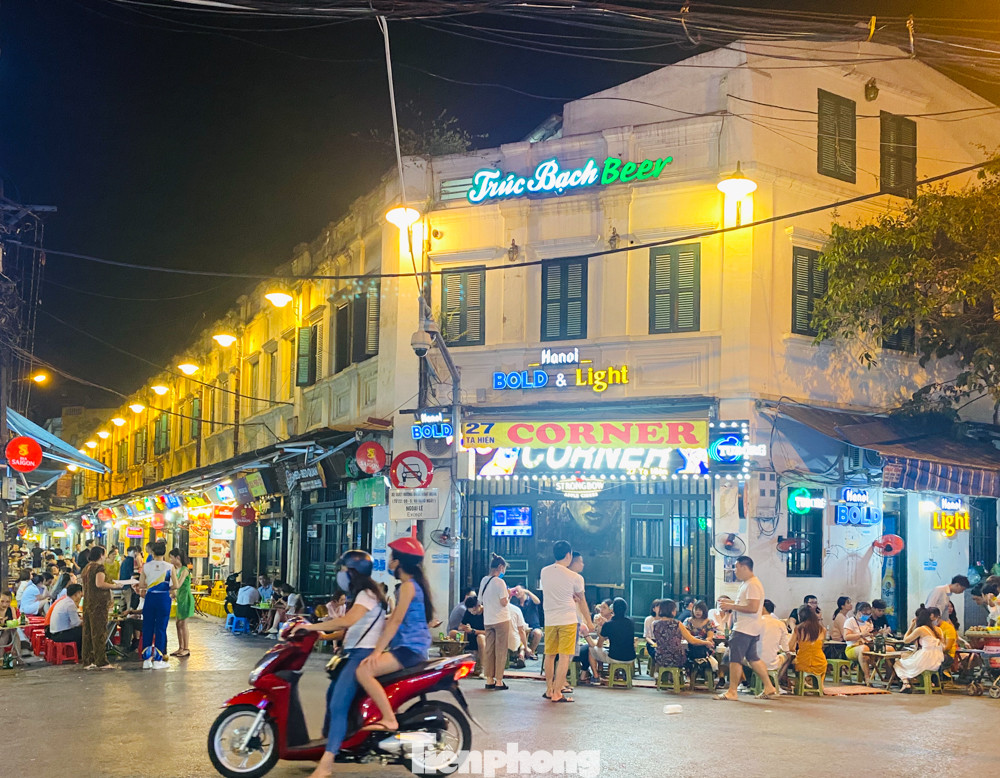 Quang cảnh khu trung tâm 'phố Tây' Tạ Hiện là nơi tập trung lượng khách nhiều nhất, trước dịch nhiều hôm bàn ghế xếp ngồi tràn ra chật kín cả lòng đường, xe cộ di chuyển qua đây rất khó khăn nhưng nay đã thông thoáng hơn rất nhiều.