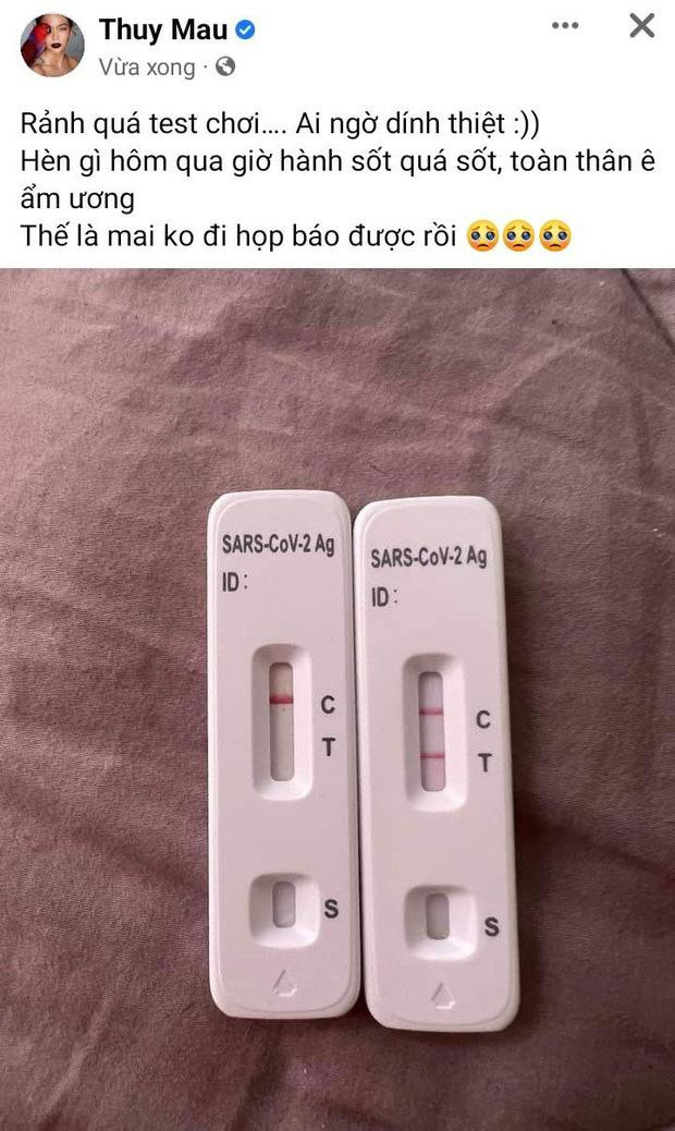 Trong khi đó, Á hậu Mâu Thủy cũng tiết lộ cô nhận kết quả test nhanh dương tính kèm những triệu chứng như sốt, đau mỏi toàn thân. Đồng thời, cô nàng phải huỷ sự kiện họp báo vào ngày mai.
