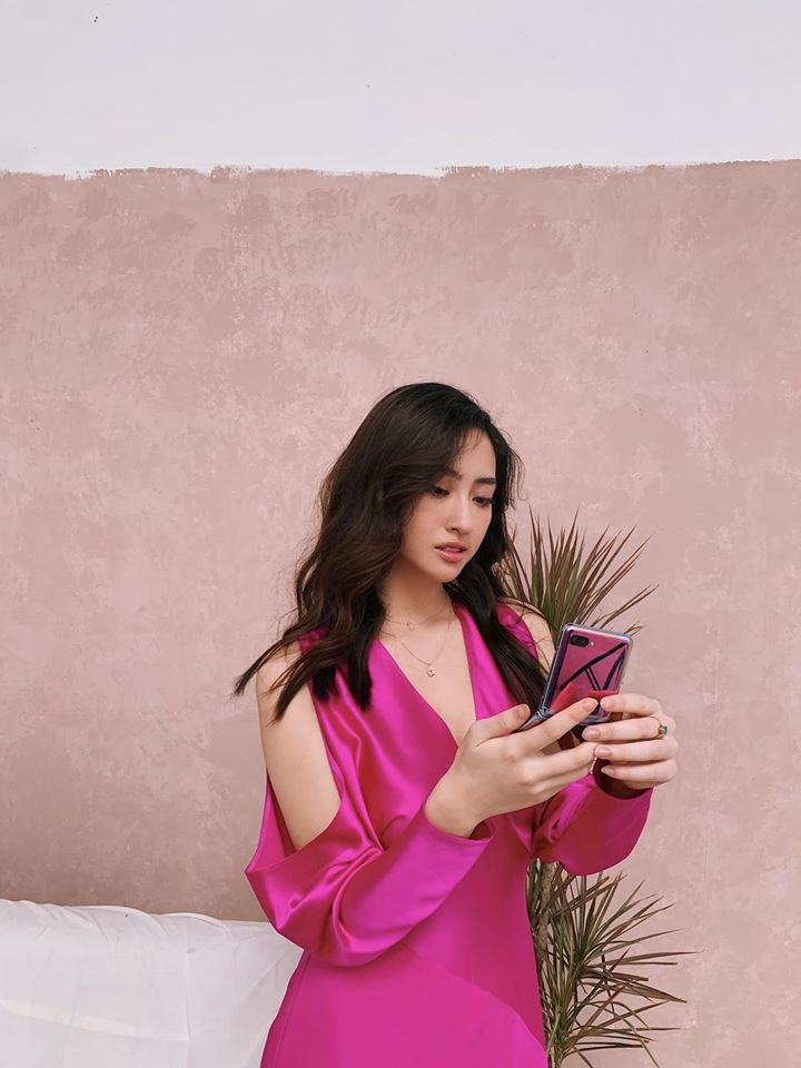 Hoa hậu Lương Thuỳ Linh diện váy hồng dịu dàng và nữ tính.