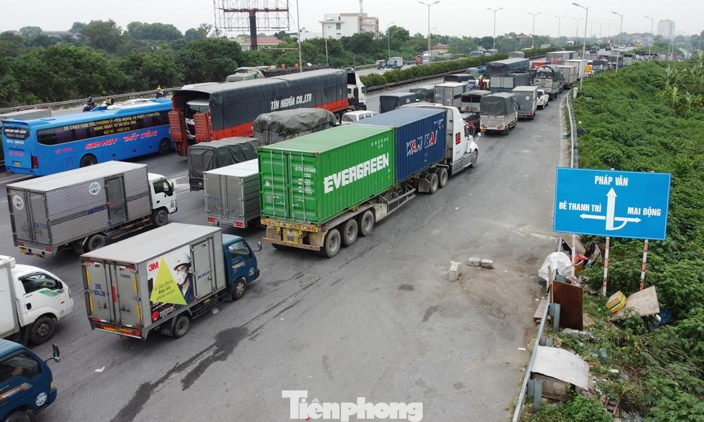 | Xe xếp hàng để xuống nút giao Lĩnh Nam, dẫn tới ùn ứ kéo dài trên đường Vành đai 3 và đường dẫn cầu Thanh Trì. |