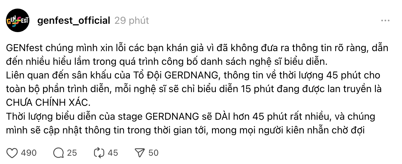 "Thông tin về thời lượng 45 phút cho toàn bộ phần trình diễn, mỗi nghệ sĩ sẽ chỉ biểu diễn 15 phút đang được lan truyền là CHƯA CHÍNH XÁC. Thời lượng biểu diễn của stage GERDNANG sẽ DÀI hơn 45 phút rất nhiều, và chúng mình sẽ cập nhật thông tin trong thời gian tới, mong mọi người kiên nhẫn chờ đợi".