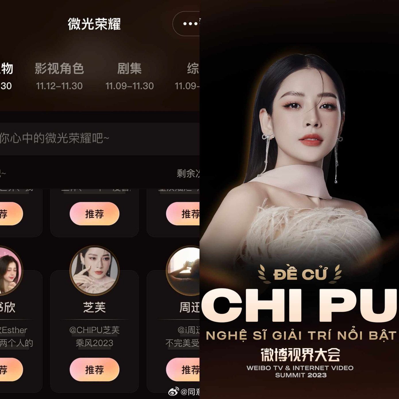 Với thành công rực rỡ khi trở thành nghệ sĩ Việt đầu tiên tham gia và đạt được tấm vé debut tại Đạp gió 2023, Chi Pu liên tiếp có những hoạt động rất sôi nổi tại Trung Quốc. Sau những nỗ lực không ngừng nghỉ, mới đây Chi Pu đã lọt vào danh sách đề cử danh hiệu "Vi quang vinh diệu - Nghệ sĩ nổi bật của năm” tại Đêm hội tầm nhìn Weibo - Weibo TV & Internet video summit 2023.