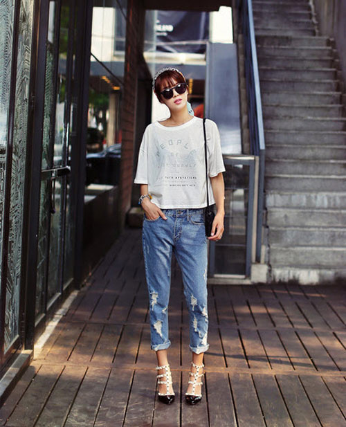 Quần jeans rách tưởng như là item chỉ hợp với phong cách đường phố bụi bặm nhưng nếu lựa chọn cẩn thận nhất là với những chiếc quần jeans rách nhẹ thì bạn hoàn toàn có thể mặc đi học hoặc thậm chí la đi làm đều được. (Tất nhiên bạn cũng không nên quá lạm dụng cách mix đồ này và môi trường học tập, làm việc của bạn tương đối thoải mái trong việc ăn mặc.)