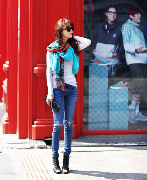 Quần jeans rách ở đầu gối phối với top trắng cực kỳ đơn giản. Phụ kiện đi kèm là chiếc khăn mang theo hơi thở mùa thu rất “chất” mà không bị phô trương quá.