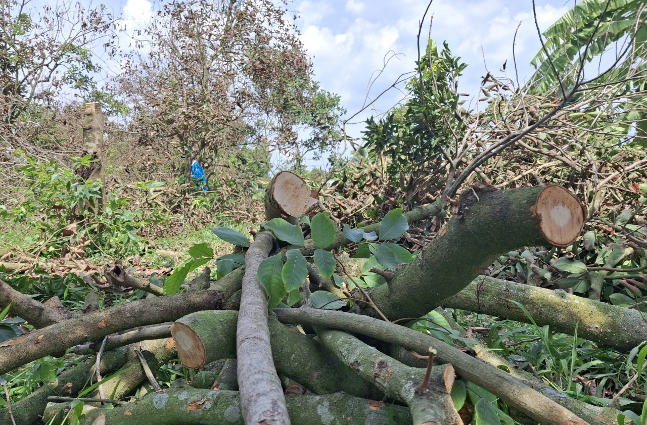| Người dân cưa bỏ những cây chôm chôm bị chết. Ảnh: T.Q |