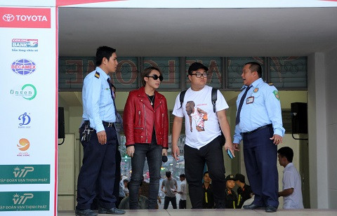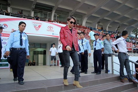 Sơn Tùng MTP (áo đỏ) có mặt từ sớm để chuẩn bị biểu diễn trước trận đấu TPHCM gặp XSKT Cần Thơ thuộc vòng 7 V-League.