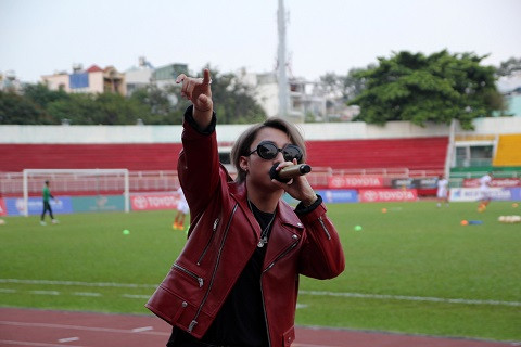 Quyền Chủ tịch CLB TP.HCM Lê Công Vinh với mối quan hệ khá thân thiết với các nghệ sĩ không khó để đưa ra lời mời kêu gọi nghệ sĩ nổi tiếng về biểu diễn để thu hút sự ủng hộ của các CĐV địa phương dành cho đội bóng sau sự cố đáng quên cuối tuần trước. Trong ảnh: Ca sĩ người Thái Bình ăn mặc phong cách và dễ dàng làm chủ sân khấu ở SVĐ Thống Nhất.