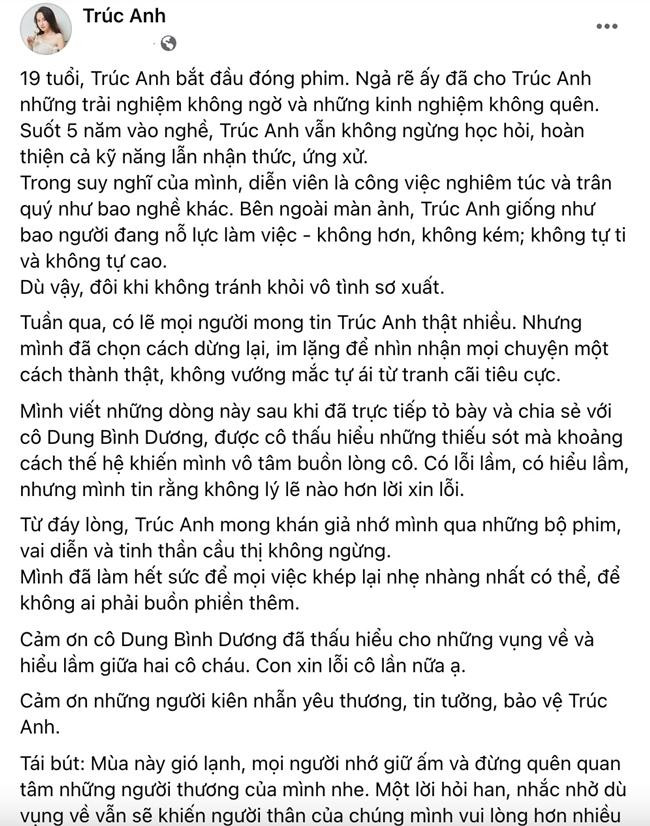 Trong bài đăng của mình, Trúc Anh khẳng định bản thân viết tâm thư sau khi đã trực tiếp bày tỏ và chia sẻ với nhà sản xuất Dung Bình Dương. Cô chia sẻ: "Mình viết những dòng này sau khi đã trực tiếp tỏ bày và chia sẻ với cô Dung Bình Dương, được cô thấu hiểu những thiếu sót mà khoảng cách thế hệ khiến mình vô tâm buồn lòng cô. Có lỗi lầm, có hiểu lầm, nhưng mình tin rằng không lý lẽ nào hơn lời xin lỗi."