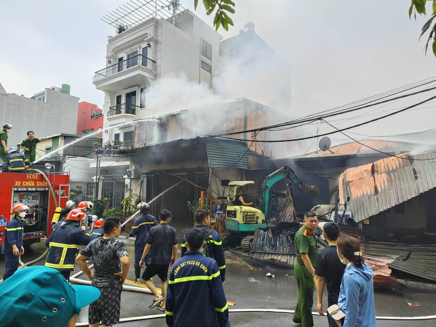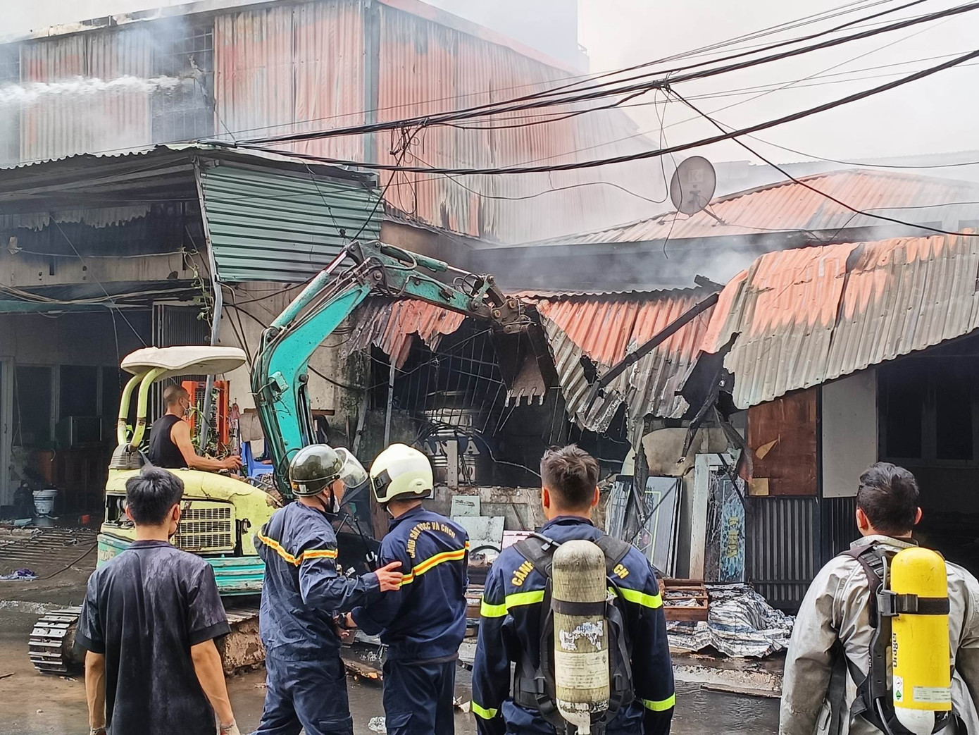 Tại hiện trường lúc 8h50, lực lượng chức năng huy động máy xúc đến phá dỡ mái tôn, tường để tiếp cận bên trong.