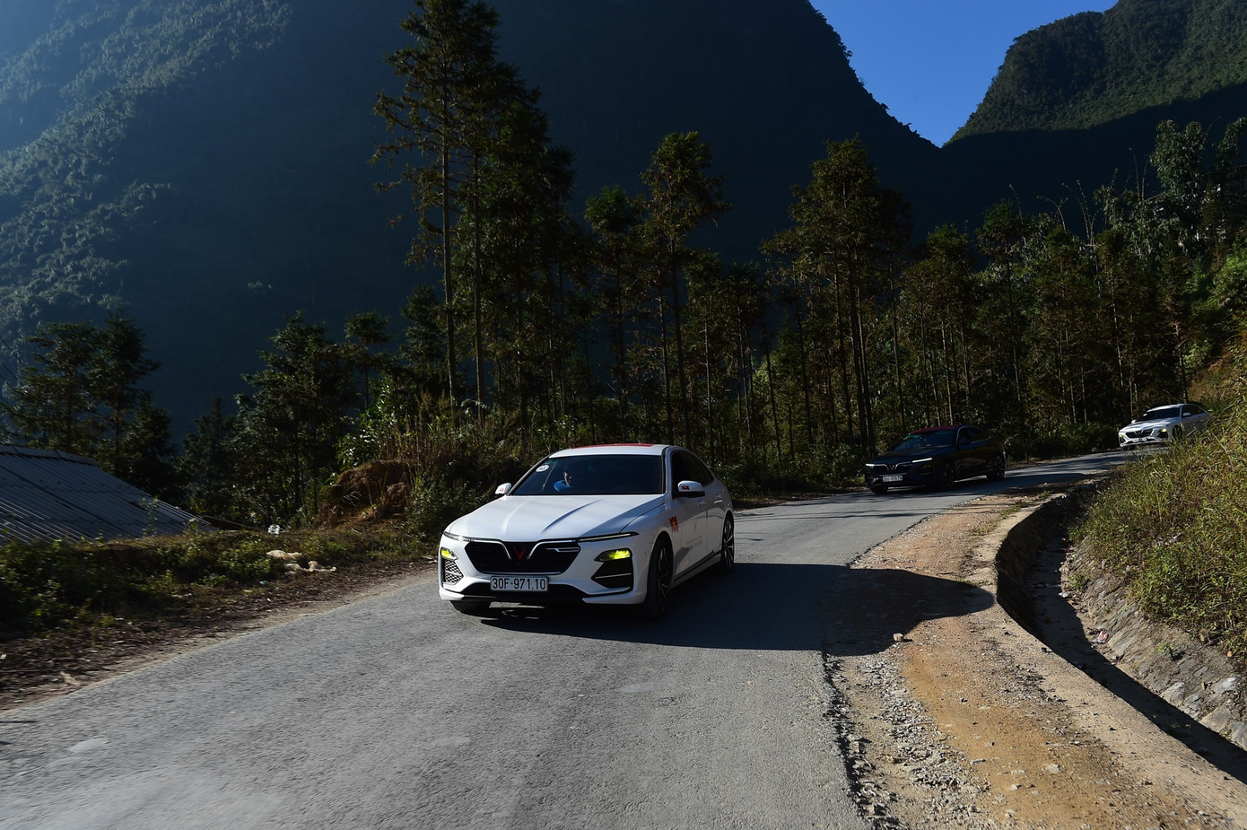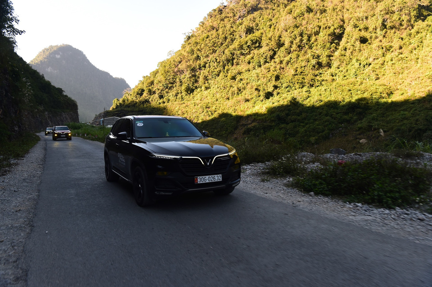 Giữa khung cảnh ấy, hình ảnh "đoàn xe quốc kỳ" của VinFast xuất hiện trong MV như một dải lụa đỏ trên những cung đường uốn lượn. Một bên là núi đá cao ngút trời, một bên là vực sâu thăm thẳm, hình ảnh đoàn xe mắt hí vén sương mờ đẹp như bức tranh thủy mặc.