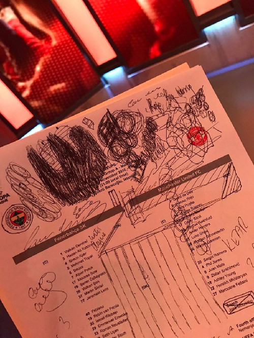 Ngoài những nét gạch đi gạch lại trên giấy, Scholes gạch chéo tên của Jose Mourinho ở phần dưới danh sách đội hình của Man Utd.