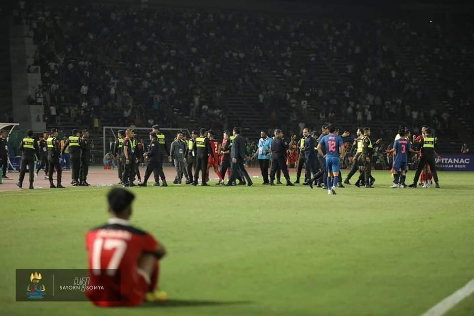 Thủ môn Thái Lan Soponvit nhảy lên đấm vào mặt trung vệ Komang, sau đó bị đánh trả. Tình huống này khiến cả hai phải nhận thẻ đỏ sau đó, vì diễn ra ngay trước mặt trọng tài chính. Ở phía khác, cầu thủ và ban huấn luyện hai bên lao vào đấm, đá và song phi vào nhau tạo ra một cảnh hỗn loạn trên sân Olympic ở Phnom Penh.