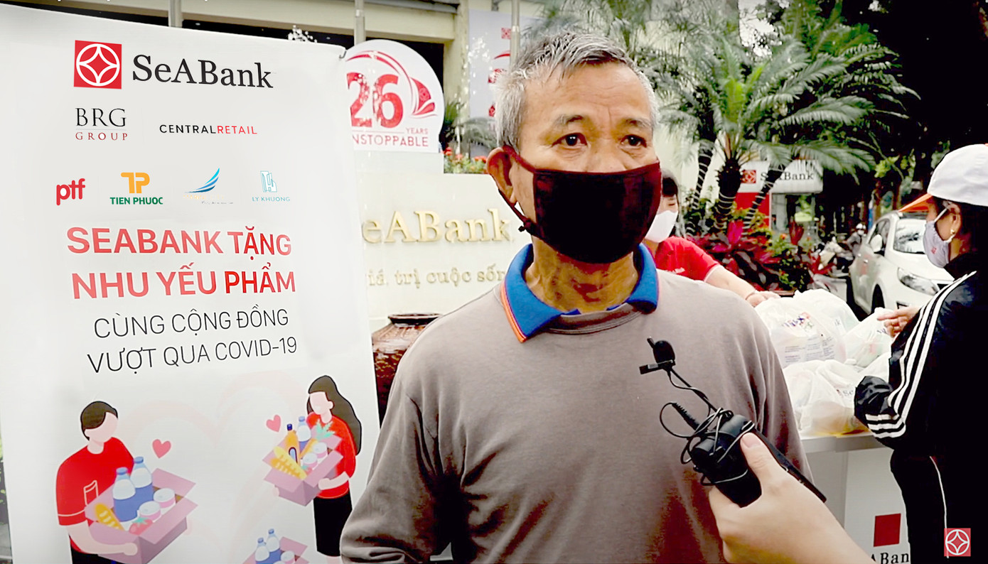 Chú Sơn (Long Biên, Hà Nội), là tài xế xe kiêm nhân viên giao hàng nay phải nghỉ làm ở nhà, cho biết: “Trước vì làm tài xế nên tôi còn có thu nhập qua ngày, kể từ ngày thực hiện “cách ly xã hội”, tôi không còn đi làm được nữa, nguồn thu tích trữ từ trước cũng dần hết, quả thực cuộc sống rất khó khăn. Khi biết tin SeABank có điểm tặng quà ở SeABank Long Biên gần nhà tôi liền đến nhận. Một miếng khi đói bằng một gói khi no, suất quà của SeABank khiến chúng tôi ấm lòng, gia đình có thêm lương thực đủ dùng trong vài ngày. Đây là một chương trình rất ý nghĩa”.