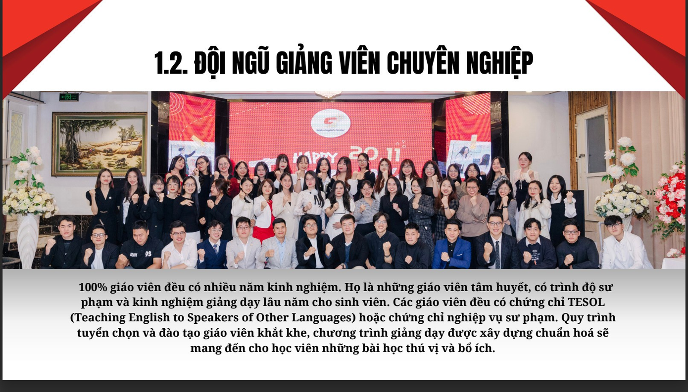 Hay như sự tham gia giảng dạy của thầy Phạm Thế Nam (Chứng chỉ TOEIC 945, Chứng chỉ IELTS 7.5,); Giảng viên nữ Lê Thị Phong (Cử nhân loại giỏi, Chứng chỉ VSTEP C1)